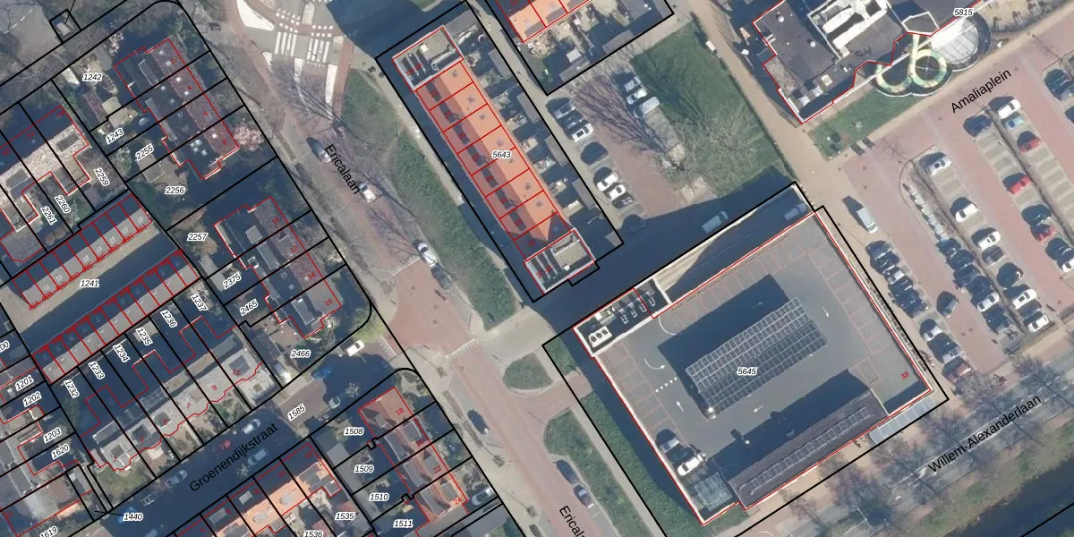 Ericalaan 39 is gelegen op kadastraal perceel LDD00B5643. Deze kadastrale aanduiding is uniek en wordt gebruikt door het Kadaster om eigendomsrechten en andere zakelijke rechten vast te leggen. Het perceel maakt onderdeel uit van de kadastrale gemeente Leiderdorp.