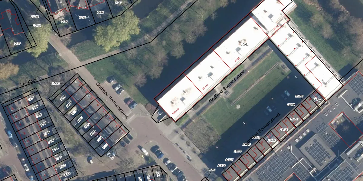Godfried Bomansstraat 100 is gelegen op kadastraal perceel LDD00A10021. Deze kadastrale aanduiding is uniek en wordt gebruikt door het Kadaster om eigendomsrechten en andere zakelijke rechten vast te leggen. Het perceel maakt onderdeel uit van de kadastrale gemeente Leiderdorp.