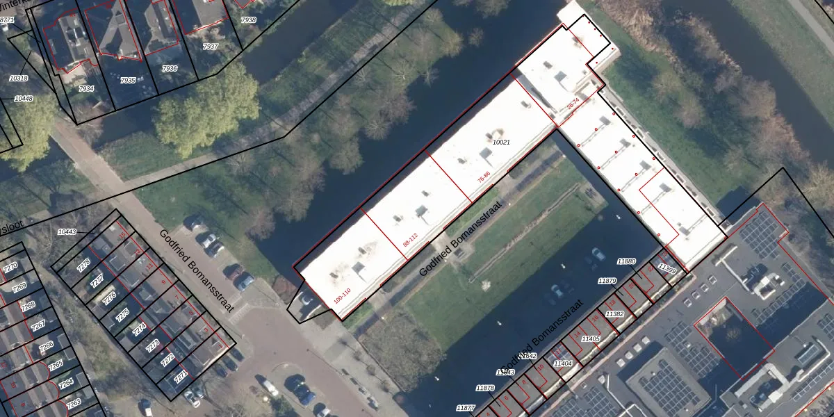 Godfried Bomansstraat 112 is gelegen op kadastraal perceel LDD00A10021. Deze kadastrale aanduiding is uniek en wordt gebruikt door het Kadaster om eigendomsrechten en andere zakelijke rechten vast te leggen. Het perceel maakt onderdeel uit van de kadastrale gemeente Leiderdorp.