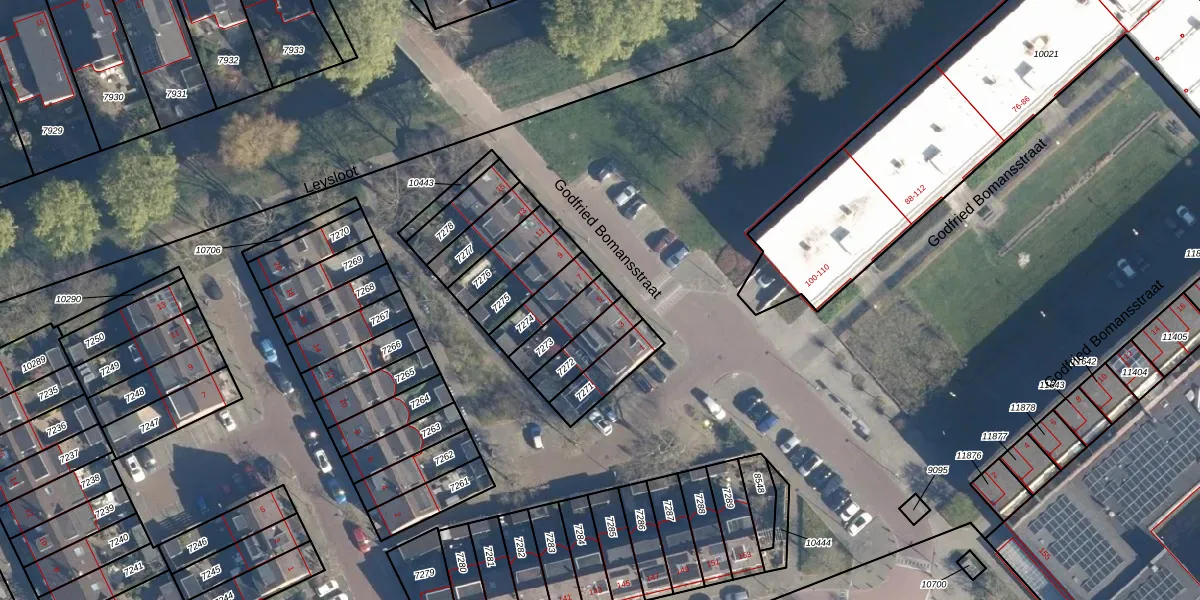 Godfried Bomansstraat 5 is gelegen op kadastraal perceel LDD00A7273. Deze kadastrale aanduiding is uniek en wordt gebruikt door het Kadaster om eigendomsrechten en andere zakelijke rechten vast te leggen. Het perceel maakt onderdeel uit van de kadastrale gemeente Leiderdorp.