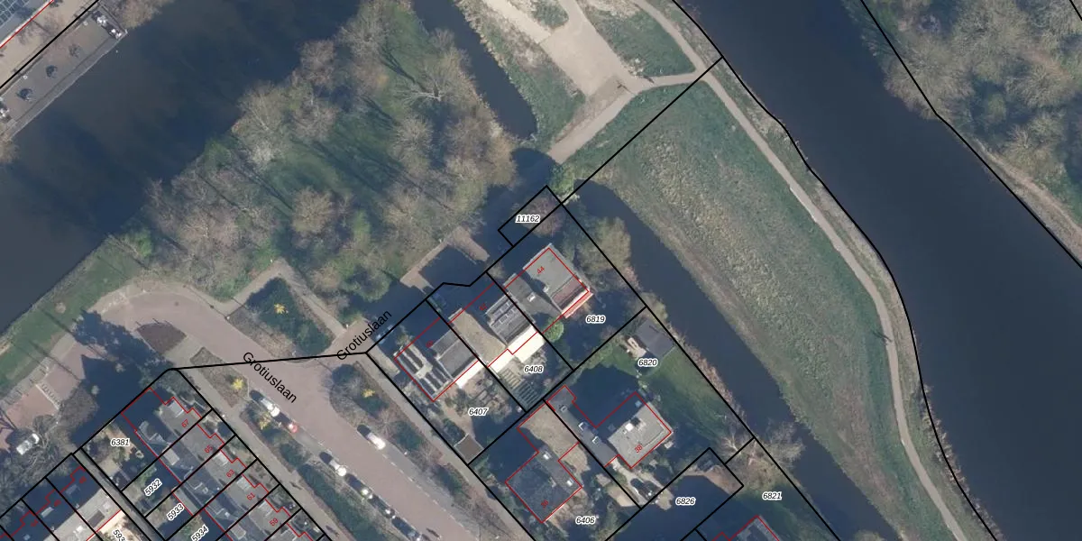 Grotiuslaan 44 is gelegen op kadastraal perceel LDD00A6819. Deze kadastrale aanduiding is uniek en wordt gebruikt door het Kadaster om eigendomsrechten en andere zakelijke rechten vast te leggen. Het perceel maakt onderdeel uit van de kadastrale gemeente Leiderdorp.