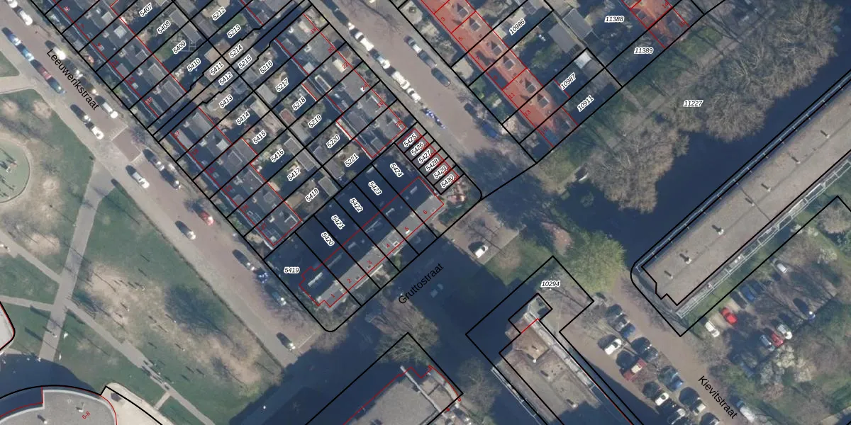 Gruttostraat 6 is gelegen op kadastraal perceel LDD00A5424. Deze kadastrale aanduiding is uniek en wordt gebruikt door het Kadaster om eigendomsrechten en andere zakelijke rechten vast te leggen. Het perceel maakt onderdeel uit van de kadastrale gemeente Leiderdorp.