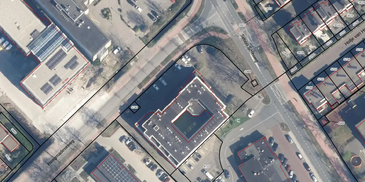 Hoogmadeseweg 104 is gelegen op kadastraal perceel LDD00B5860. Deze kadastrale aanduiding is uniek en wordt gebruikt door het Kadaster om eigendomsrechten en andere zakelijke rechten vast te leggen. Het perceel maakt onderdeel uit van de kadastrale gemeente Leiderdorp.