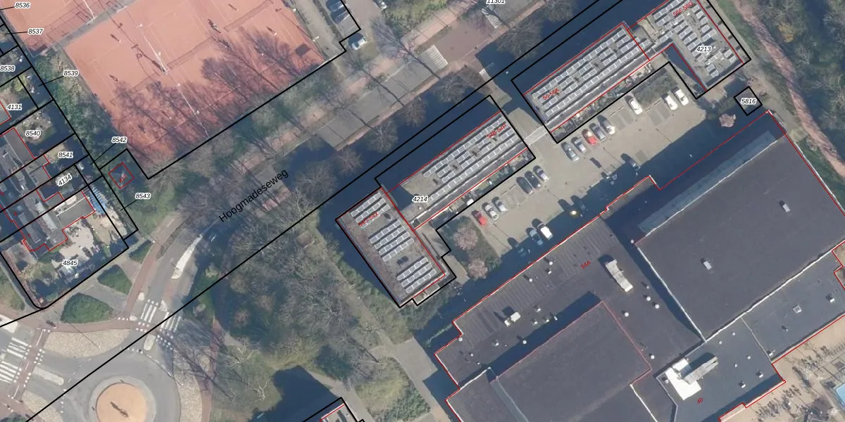 Hoogmadeseweg 54-P is gelegen op kadastraal perceel LDD00B4214. Deze kadastrale aanduiding is uniek en wordt gebruikt door het Kadaster om eigendomsrechten en andere zakelijke rechten vast te leggen. Het perceel maakt onderdeel uit van de kadastrale gemeente Leiderdorp.