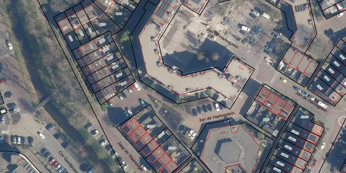 Het perceel waarop Jan de Hartogplein 56 staat heeft een oppervlakte van 3730 m². Dit is een zeer groot perceel. De perceeloppervlakte wordt geregistreerd door het Kadaster. Gedetailleerde informatie over de maten van dit perceel kunt u vinden in het rapport Kadastrale kaart met maatvoering van Jan de Hartogplein 56.