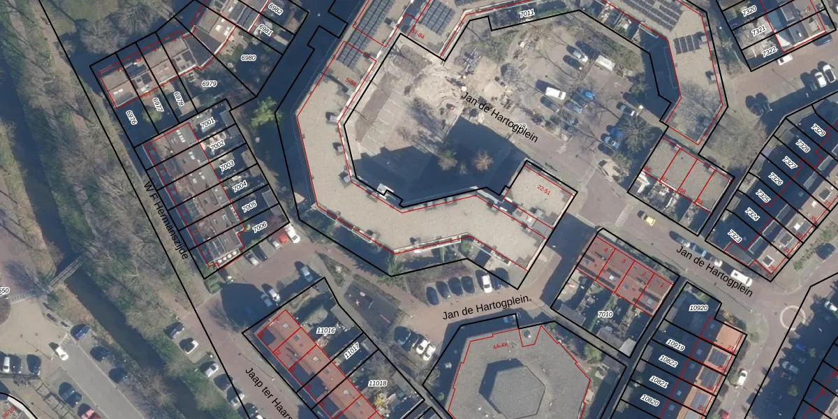 Jan de Hartogplein 7 is gelegen op kadastraal perceel LDD00A7011. Deze kadastrale aanduiding is uniek en wordt gebruikt door het Kadaster om eigendomsrechten en andere zakelijke rechten vast te leggen. Het perceel maakt onderdeel uit van de kadastrale gemeente Leiderdorp.