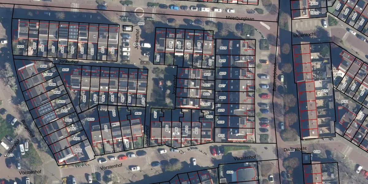 Het perceel waarop Jonkerhof 3 staat heeft een oppervlakte van 107 m². Dit is een middelgroot perceel. De perceeloppervlakte wordt geregistreerd door het Kadaster. Gedetailleerde informatie over de maten van dit perceel kunt u vinden in het rapport Kadastrale kaart met maatvoering van Jonkerhof 3.