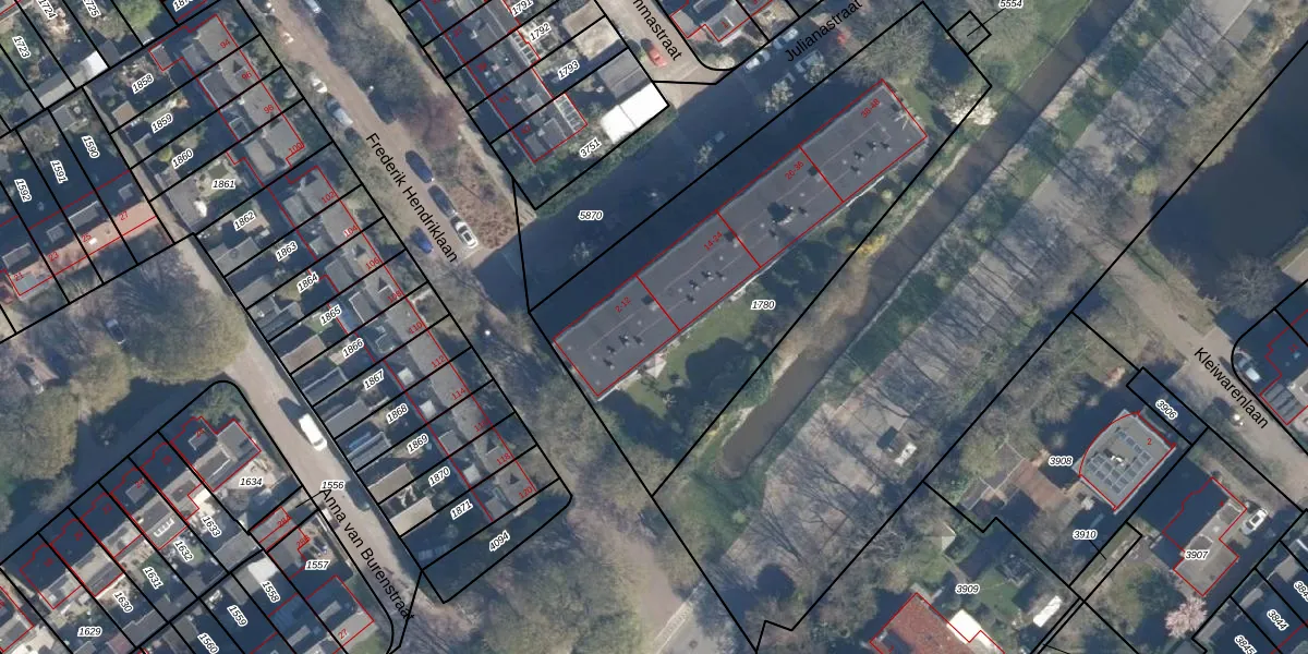 Het perceel waarop Julianastraat 12 staat heeft een oppervlakte van 1971 m². Dit is een zeer groot perceel. De perceeloppervlakte wordt geregistreerd door het Kadaster. Gedetailleerde informatie over de maten van dit perceel kunt u vinden in het rapport Kadastrale kaart met maatvoering van Julianastraat 12.