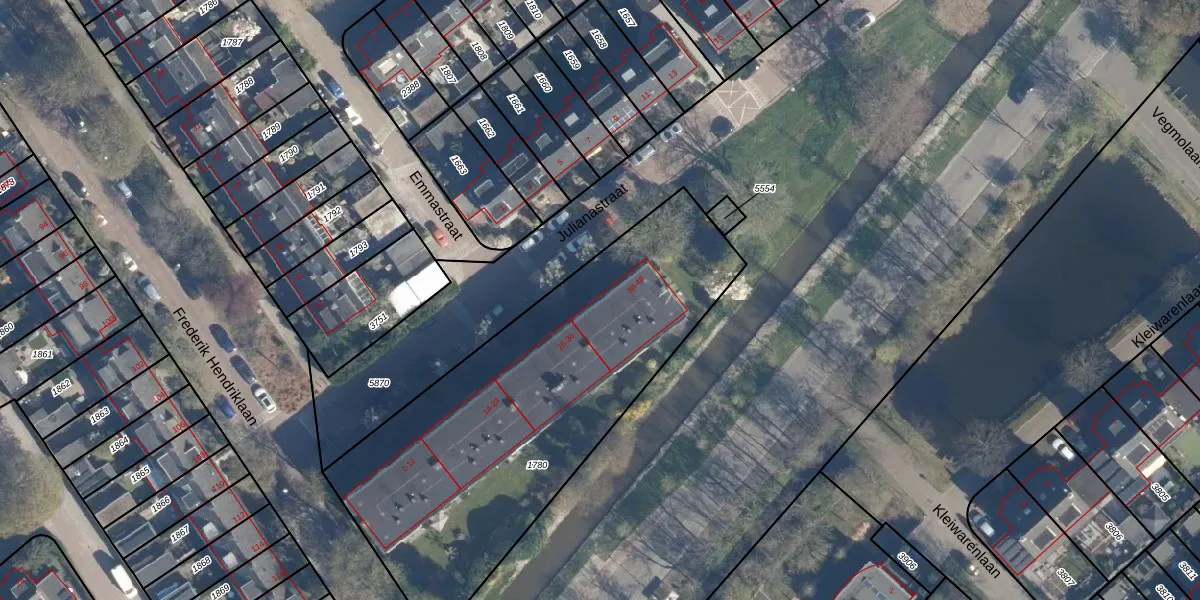 Het perceel waarop Julianastraat 38 staat heeft een oppervlakte van 1971 m². Dit is een zeer groot perceel. De perceeloppervlakte wordt geregistreerd door het Kadaster. Gedetailleerde informatie over de maten van dit perceel kunt u vinden in het rapport Kadastrale kaart met maatvoering van Julianastraat 38.