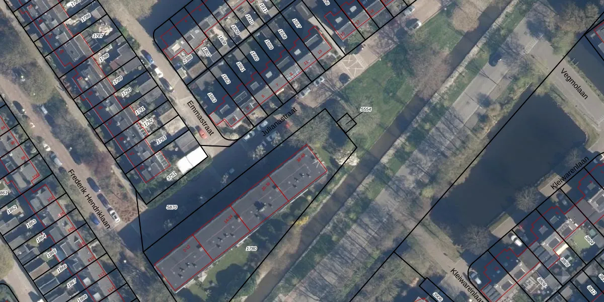 Het perceel waarop Julianastraat 44 staat heeft een oppervlakte van 1971 m². Dit is een zeer groot perceel. De perceeloppervlakte wordt geregistreerd door het Kadaster. Gedetailleerde informatie over de maten van dit perceel kunt u vinden in het rapport Kadastrale kaart met maatvoering van Julianastraat 44.