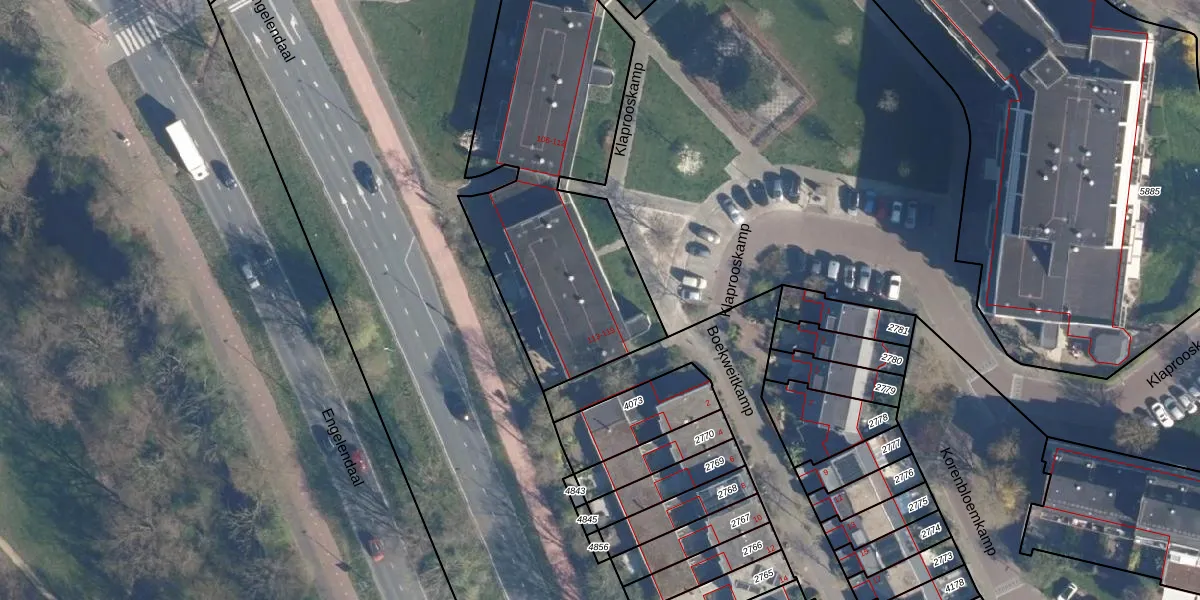 Het perceel waarop Klaprooskamp 114 staat heeft een oppervlakte van 2146 m². Dit is een zeer groot perceel. De perceeloppervlakte wordt geregistreerd door het Kadaster. Gedetailleerde informatie over de maten van dit perceel kunt u vinden in het rapport Kadastrale kaart met maatvoering van Klaprooskamp 114.