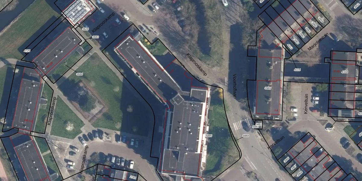 Het perceel waarop Klaprooskamp 75 staat heeft een oppervlakte van 3346 m². Dit is een zeer groot perceel. De perceeloppervlakte wordt geregistreerd door het Kadaster. Gedetailleerde informatie over de maten van dit perceel kunt u vinden in het rapport Kadastrale kaart met maatvoering van Klaprooskamp 75.