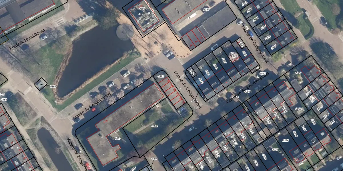 Louise de Colignystraat 2-E is gelegen op kadastraal perceel LDD00B5921. Deze kadastrale aanduiding is uniek en wordt gebruikt door het Kadaster om eigendomsrechten en andere zakelijke rechten vast te leggen. Het perceel maakt onderdeel uit van de kadastrale gemeente Leiderdorp.