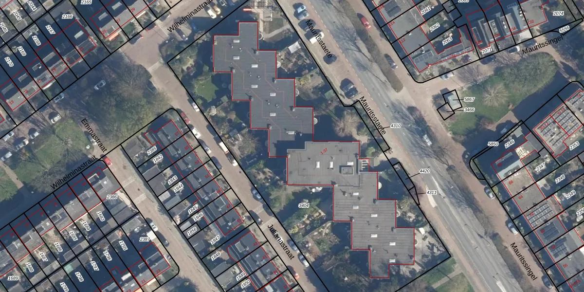 Het perceel waarop Mauritsstaete 14 staat heeft een oppervlakte van 4628 m². Dit is een zeer groot perceel. De perceeloppervlakte wordt geregistreerd door het Kadaster. Gedetailleerde informatie over de maten van dit perceel kunt u vinden in het rapport Kadastrale kaart met maatvoering van Mauritsstaete 14.