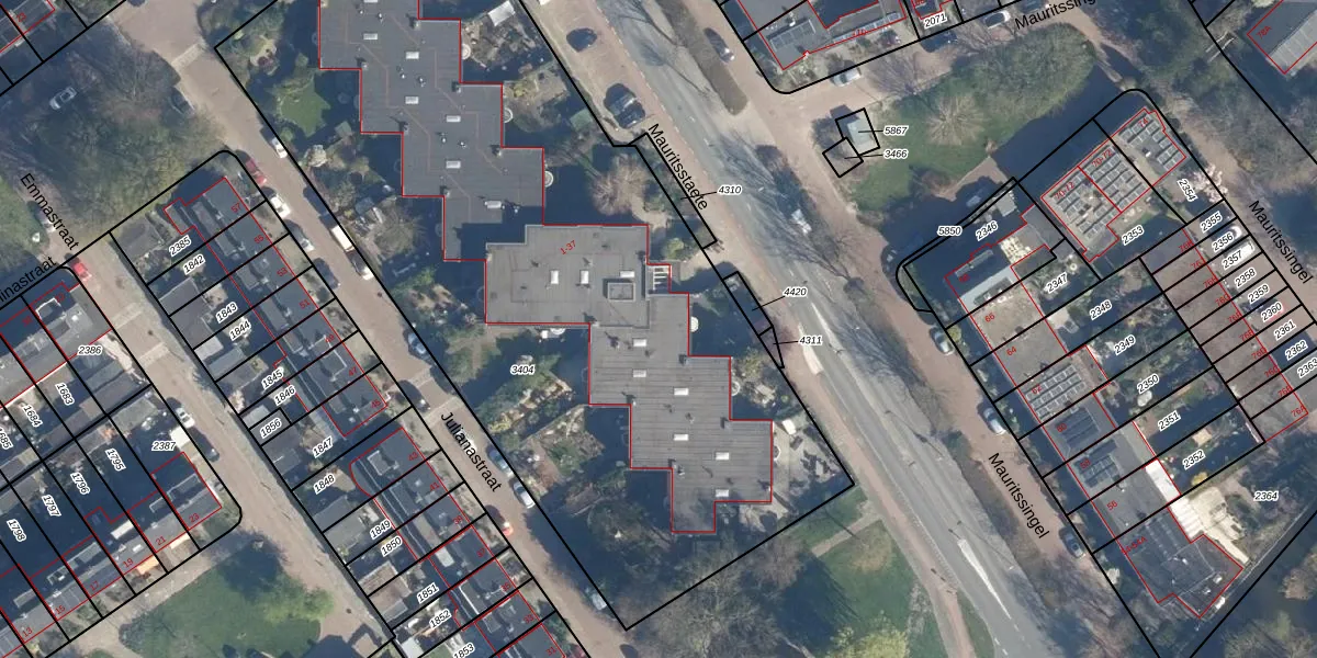 Het perceel waarop Mauritsstaete 23 staat heeft een oppervlakte van 4628 m². Dit is een zeer groot perceel. De perceeloppervlakte wordt geregistreerd door het Kadaster. Gedetailleerde informatie over de maten van dit perceel kunt u vinden in het rapport Kadastrale kaart met maatvoering van Mauritsstaete 23.