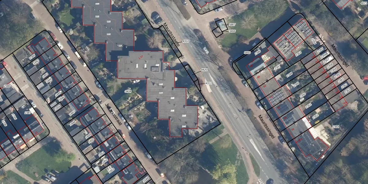 Het perceel waarop Mauritsstaete 7 staat heeft een oppervlakte van 4628 m². Dit is een zeer groot perceel. De perceeloppervlakte wordt geregistreerd door het Kadaster. Gedetailleerde informatie over de maten van dit perceel kunt u vinden in het rapport Kadastrale kaart met maatvoering van Mauritsstaete 7.