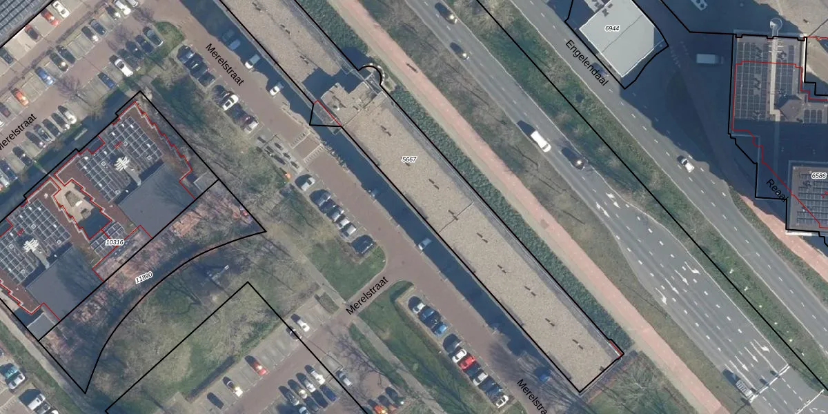 Het perceel waarop Merelstraat 13-A staat heeft een oppervlakte van 1945 m². Dit is een zeer groot perceel. De perceeloppervlakte wordt geregistreerd door het Kadaster. Gedetailleerde informatie over de maten van dit perceel kunt u vinden in het rapport Kadastrale kaart met maatvoering van Merelstraat 13-A.