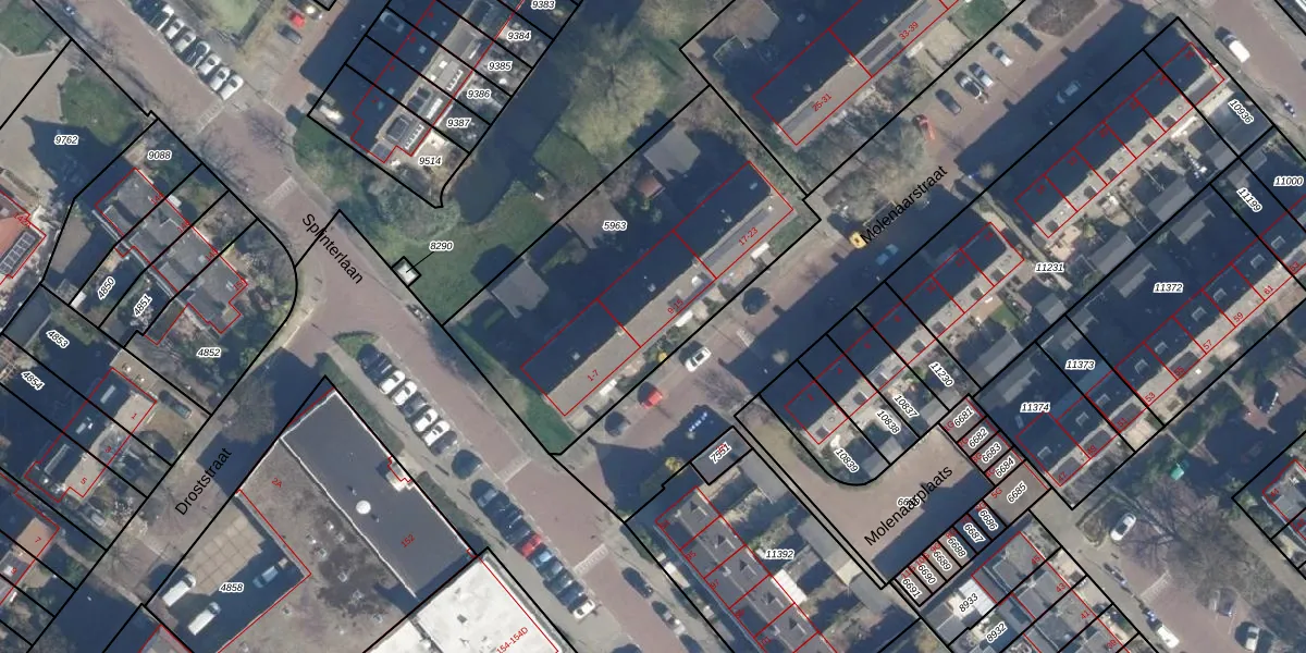 Molenaarstraat 9 is gelegen op kadastraal perceel LDD00A5963. Deze kadastrale aanduiding is uniek en wordt gebruikt door het Kadaster om eigendomsrechten en andere zakelijke rechten vast te leggen. Het perceel maakt onderdeel uit van de kadastrale gemeente Leiderdorp.