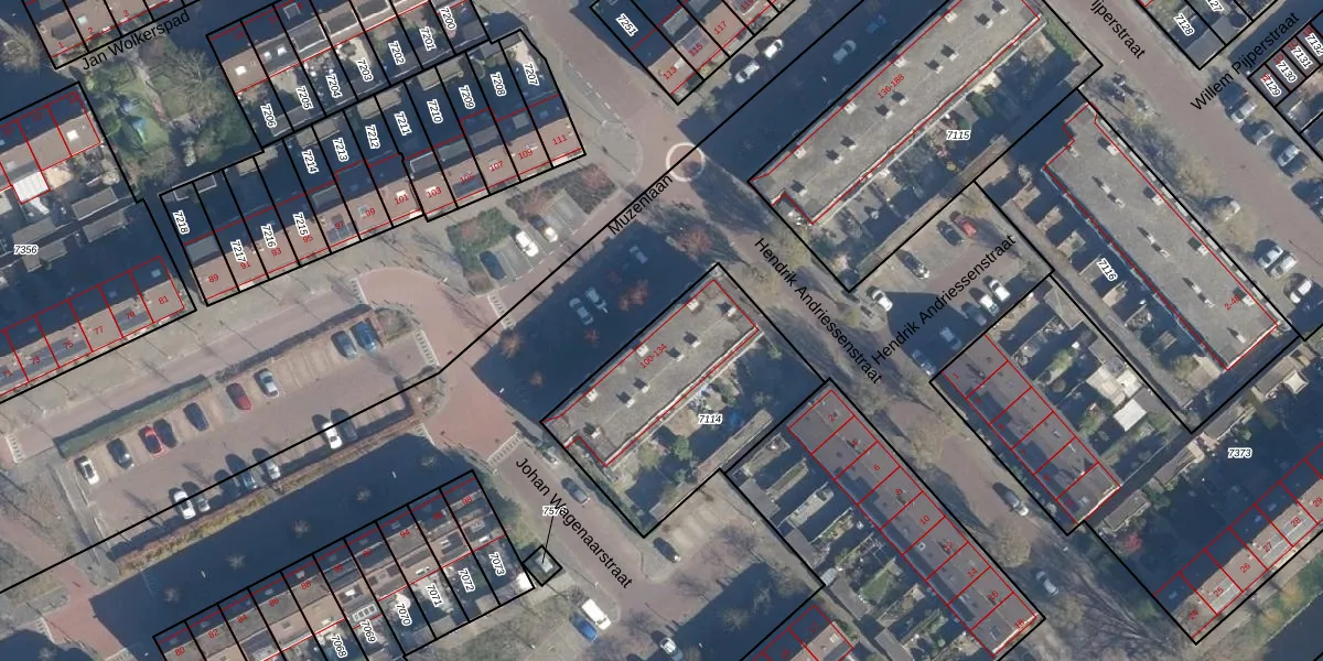 Muzenlaan 106 is gelegen op kadastraal perceel LDD00A7114. Deze kadastrale aanduiding is uniek en wordt gebruikt door het Kadaster om eigendomsrechten en andere zakelijke rechten vast te leggen. Het perceel maakt onderdeel uit van de kadastrale gemeente Leiderdorp.