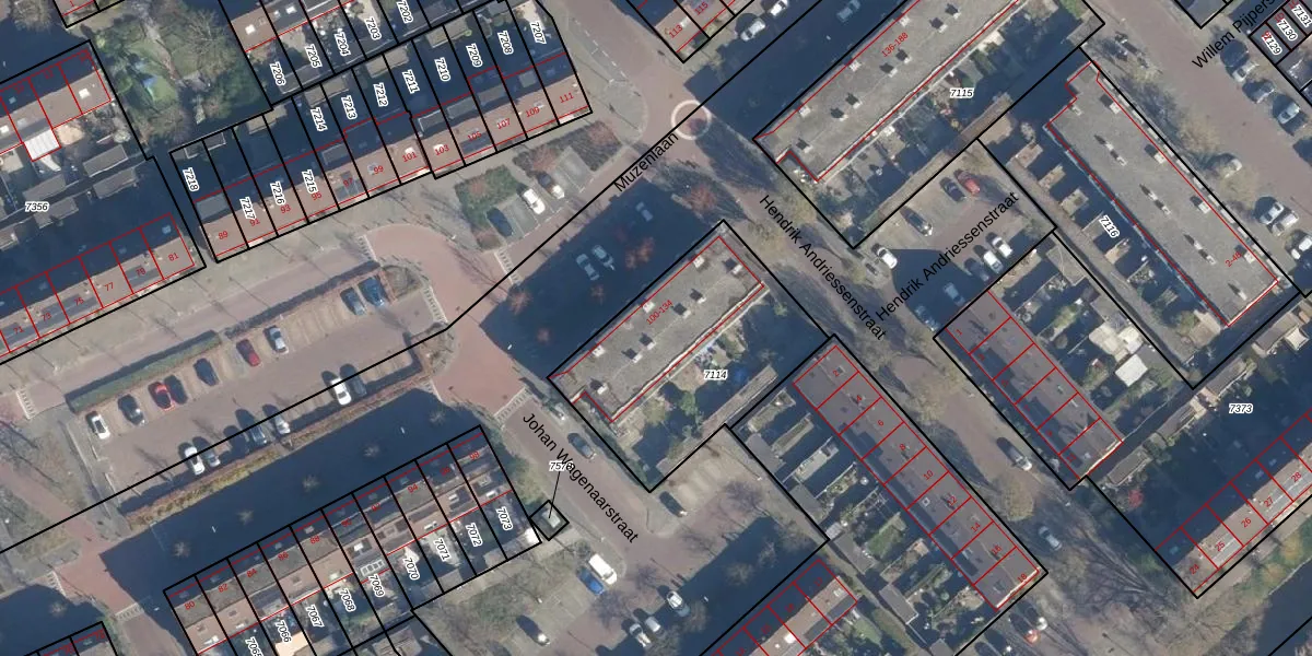 Muzenlaan 116 is gelegen op kadastraal perceel LDD00A7114. Deze kadastrale aanduiding is uniek en wordt gebruikt door het Kadaster om eigendomsrechten en andere zakelijke rechten vast te leggen. Het perceel maakt onderdeel uit van de kadastrale gemeente Leiderdorp.