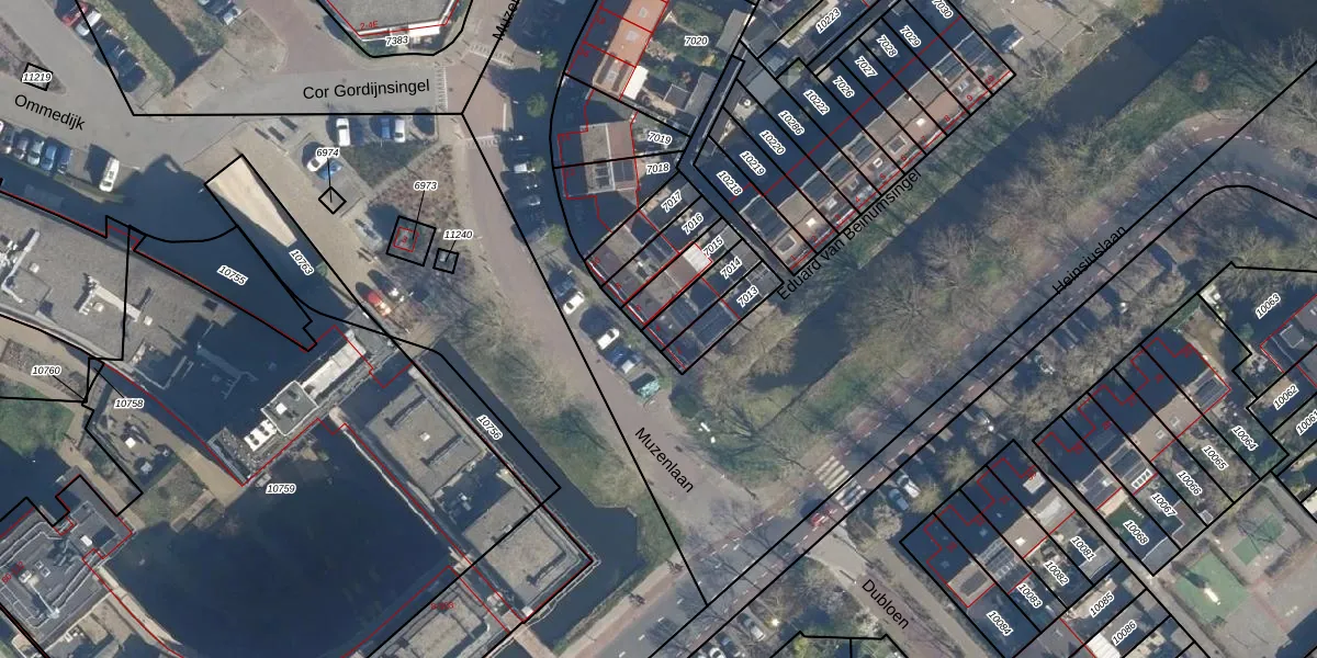 Muzenlaan 4 is gelegen op kadastraal perceel LDD00A7014. Deze kadastrale aanduiding is uniek en wordt gebruikt door het Kadaster om eigendomsrechten en andere zakelijke rechten vast te leggen. Het perceel maakt onderdeel uit van de kadastrale gemeente Leiderdorp.