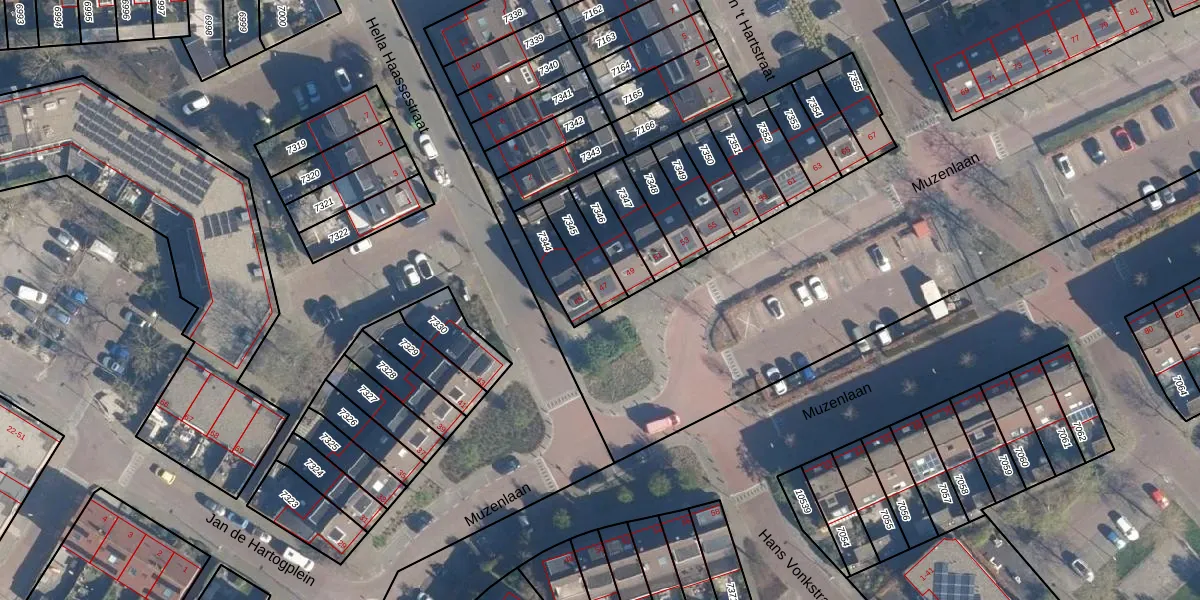 Muzenlaan 47 is gelegen op kadastraal perceel LDD00A7345. Deze kadastrale aanduiding is uniek en wordt gebruikt door het Kadaster om eigendomsrechten en andere zakelijke rechten vast te leggen. Het perceel maakt onderdeel uit van de kadastrale gemeente Leiderdorp.