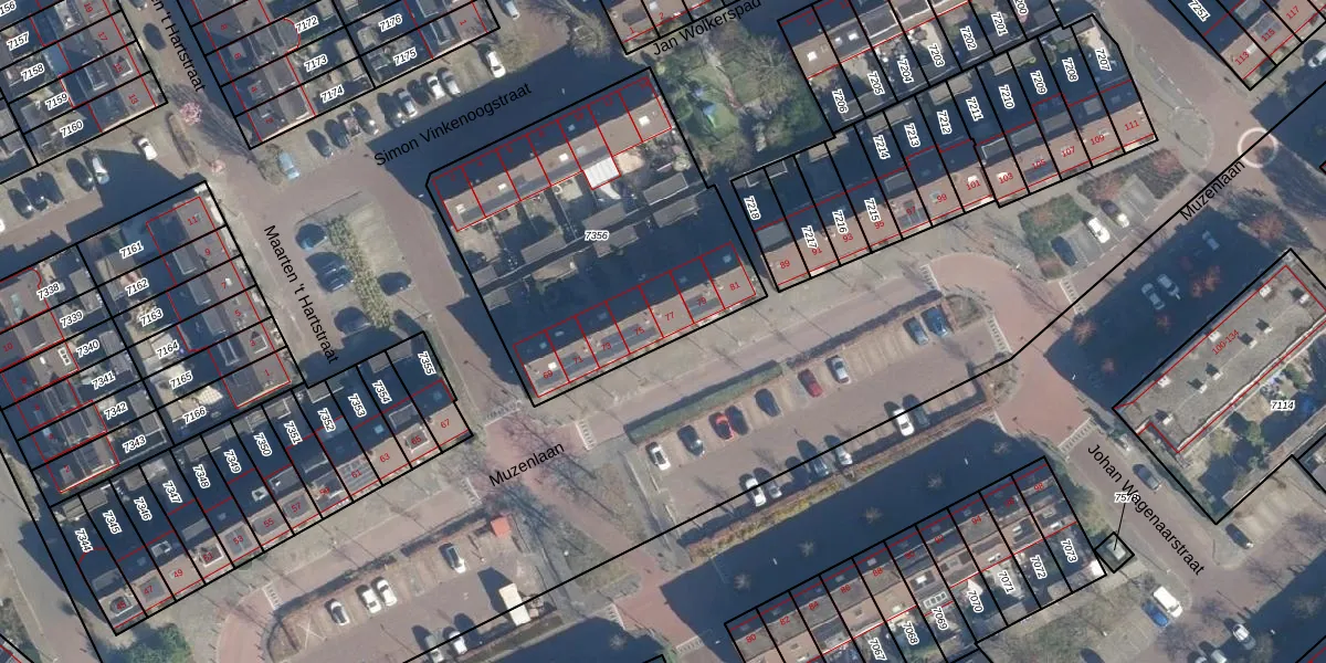 Muzenlaan 77 is gelegen op kadastraal perceel LDD00A7356. Deze kadastrale aanduiding is uniek en wordt gebruikt door het Kadaster om eigendomsrechten en andere zakelijke rechten vast te leggen. Het perceel maakt onderdeel uit van de kadastrale gemeente Leiderdorp.