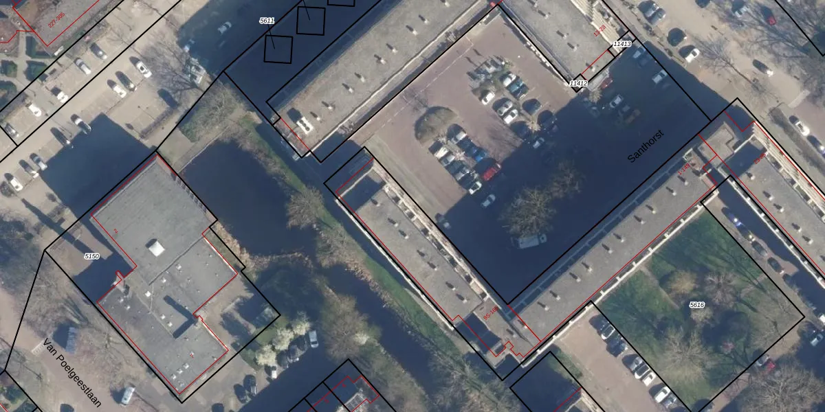 Het perceel waarop Santhorst 13-S staat heeft een oppervlakte van 3876 m². Dit is een zeer groot perceel. De perceeloppervlakte wordt geregistreerd door het Kadaster. Gedetailleerde informatie over de maten van dit perceel kunt u vinden in het rapport Kadastrale kaart met maatvoering van Santhorst 13-S.