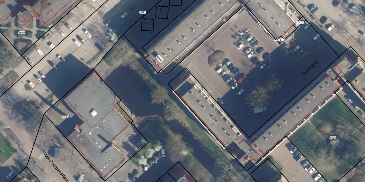 Het perceel waarop Santhorst 165 staat heeft een oppervlakte van 3876 m². Dit is een zeer groot perceel. De perceeloppervlakte wordt geregistreerd door het Kadaster. Gedetailleerde informatie over de maten van dit perceel kunt u vinden in het rapport Kadastrale kaart met maatvoering van Santhorst 165.
