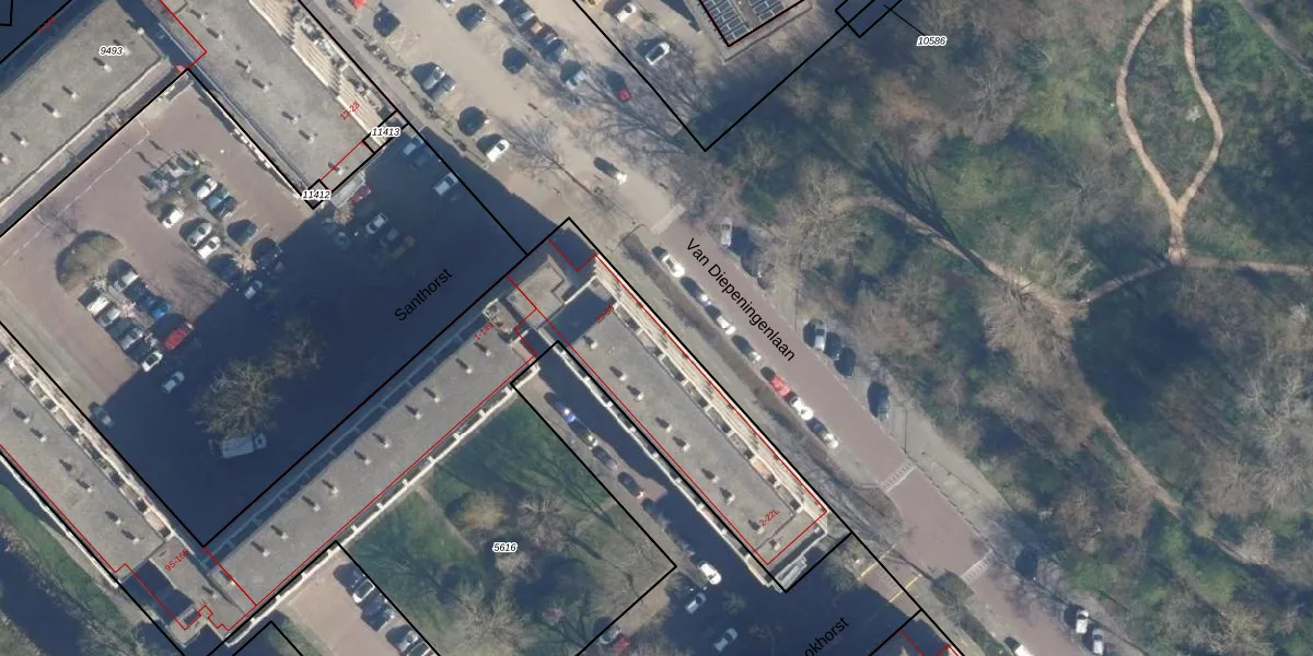 Het perceel waarop Santhorst 27 staat heeft een oppervlakte van 3876 m². Dit is een zeer groot perceel. De perceeloppervlakte wordt geregistreerd door het Kadaster. Gedetailleerde informatie over de maten van dit perceel kunt u vinden in het rapport Kadastrale kaart met maatvoering van Santhorst 27.