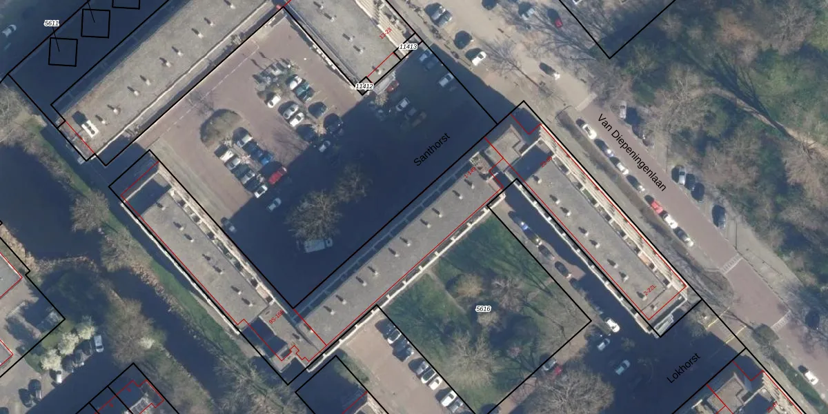 Het perceel waarop Santhorst 3-S staat heeft een oppervlakte van 3876 m². Dit is een zeer groot perceel. De perceeloppervlakte wordt geregistreerd door het Kadaster. Gedetailleerde informatie over de maten van dit perceel kunt u vinden in het rapport Kadastrale kaart met maatvoering van Santhorst 3-S.