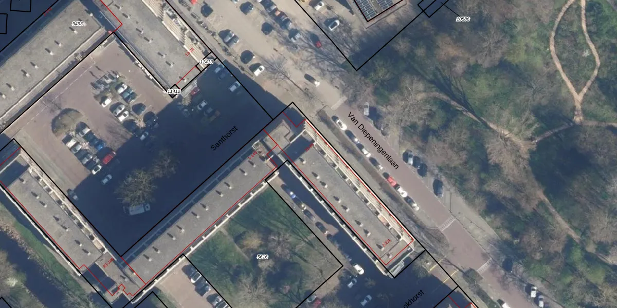 Het perceel waarop Santhorst 69 staat heeft een oppervlakte van 3876 m². Dit is een zeer groot perceel. De perceeloppervlakte wordt geregistreerd door het Kadaster. Gedetailleerde informatie over de maten van dit perceel kunt u vinden in het rapport Kadastrale kaart met maatvoering van Santhorst 69.