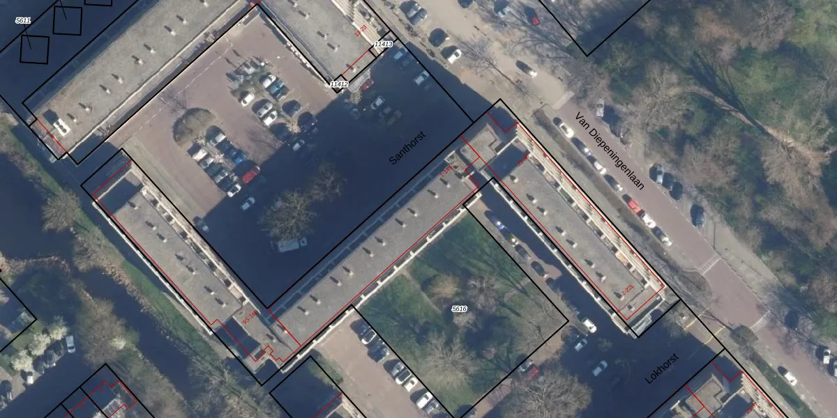 Het perceel waarop Santhorst 91 staat heeft een oppervlakte van 3876 m². Dit is een zeer groot perceel. De perceeloppervlakte wordt geregistreerd door het Kadaster. Gedetailleerde informatie over de maten van dit perceel kunt u vinden in het rapport Kadastrale kaart met maatvoering van Santhorst 91.
