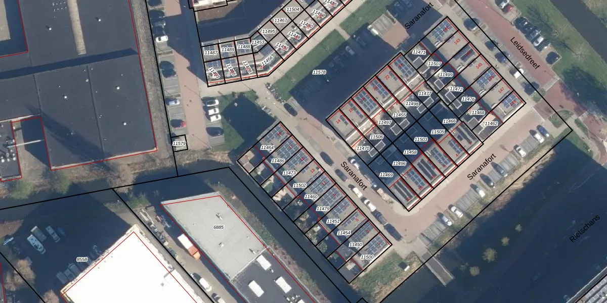 Saranafort 15 is gelegen op kadastraal perceel LDD00A11473. Deze kadastrale aanduiding is uniek en wordt gebruikt door het Kadaster om eigendomsrechten en andere zakelijke rechten vast te leggen. Het perceel maakt onderdeel uit van de kadastrale gemeente Leiderdorp.
