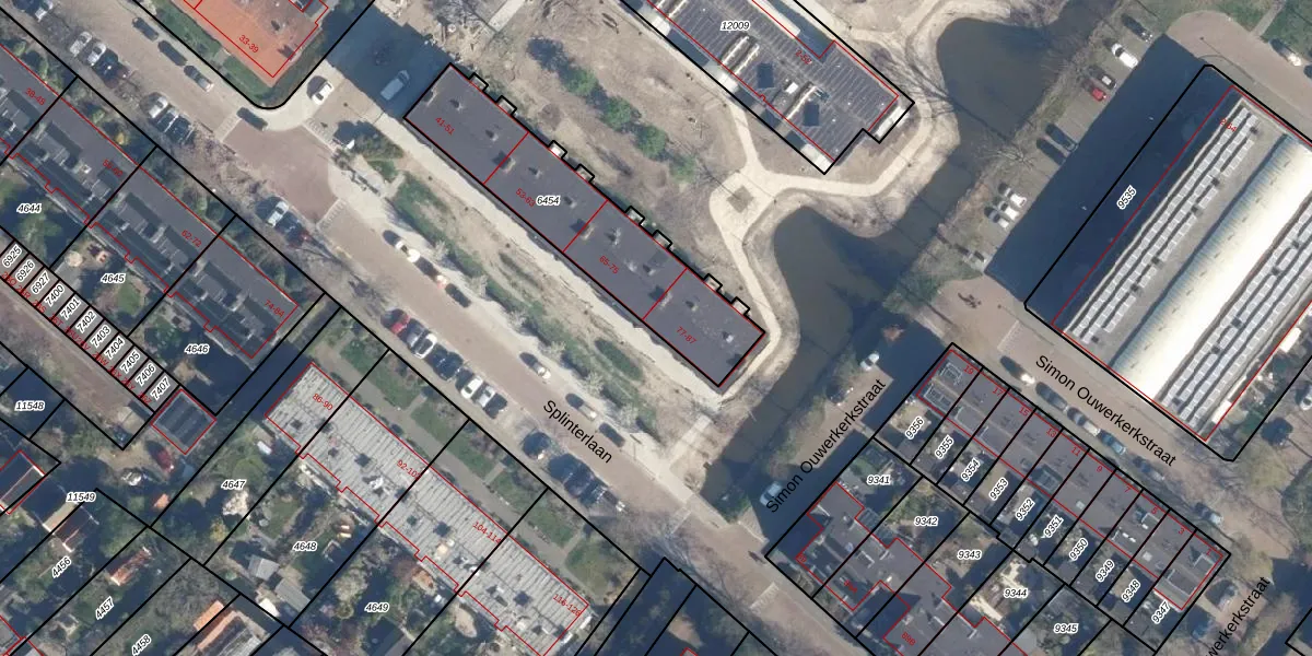Splinterlaan 77 is gelegen op kadastraal perceel LDD00A6454. Deze kadastrale aanduiding is uniek en wordt gebruikt door het Kadaster om eigendomsrechten en andere zakelijke rechten vast te leggen. Het perceel maakt onderdeel uit van de kadastrale gemeente Leiderdorp.