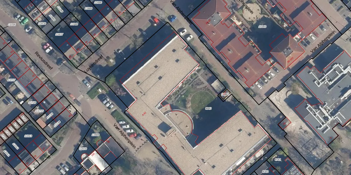 Het perceel waarop Van Alphenplein 19 staat heeft een oppervlakte van 4745 m². Dit is een zeer groot perceel. De perceeloppervlakte wordt geregistreerd door het Kadaster. Gedetailleerde informatie over de maten van dit perceel kunt u vinden in het rapport Kadastrale kaart met maatvoering van Van Alphenplein 19.
