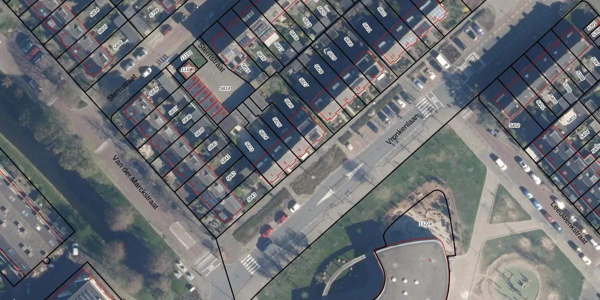 Vronkenlaan 5 is gelegen op kadastraal perceel LDD00A5825. Deze kadastrale aanduiding is uniek en wordt gebruikt door het Kadaster om eigendomsrechten en andere zakelijke rechten vast te leggen. Het perceel maakt onderdeel uit van de kadastrale gemeente Leiderdorp.
