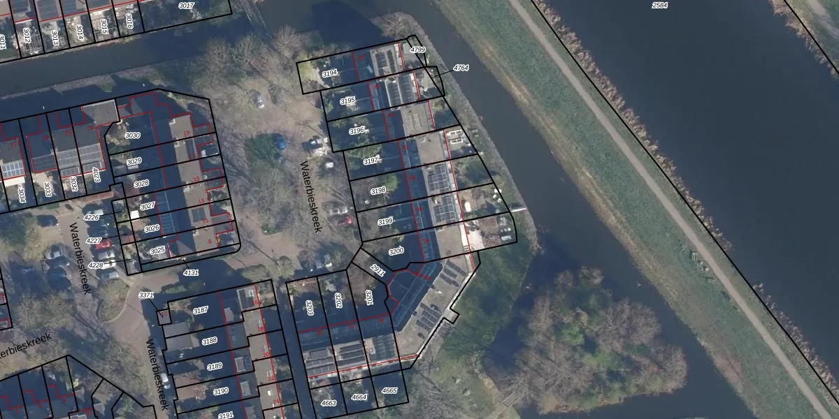 Waterbieskreek 38 is gelegen op kadastraal perceel LDD00B3199. Deze kadastrale aanduiding is uniek en wordt gebruikt door het Kadaster om eigendomsrechten en andere zakelijke rechten vast te leggen. Het perceel maakt onderdeel uit van de kadastrale gemeente Leiderdorp.