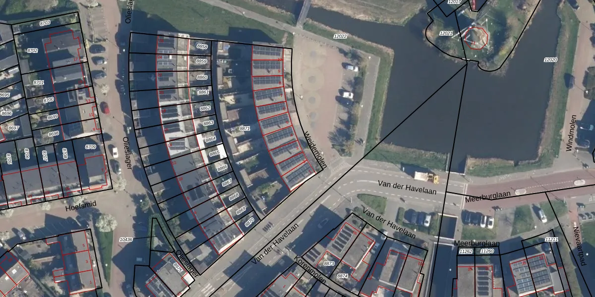 Het perceel waarop Weidemolen 3 staat heeft een oppervlakte van 1432 m². Dit is een zeer groot perceel. De perceeloppervlakte wordt geregistreerd door het Kadaster. Gedetailleerde informatie over de maten van dit perceel kunt u vinden in het rapport Kadastrale kaart met maatvoering van Weidemolen 3.