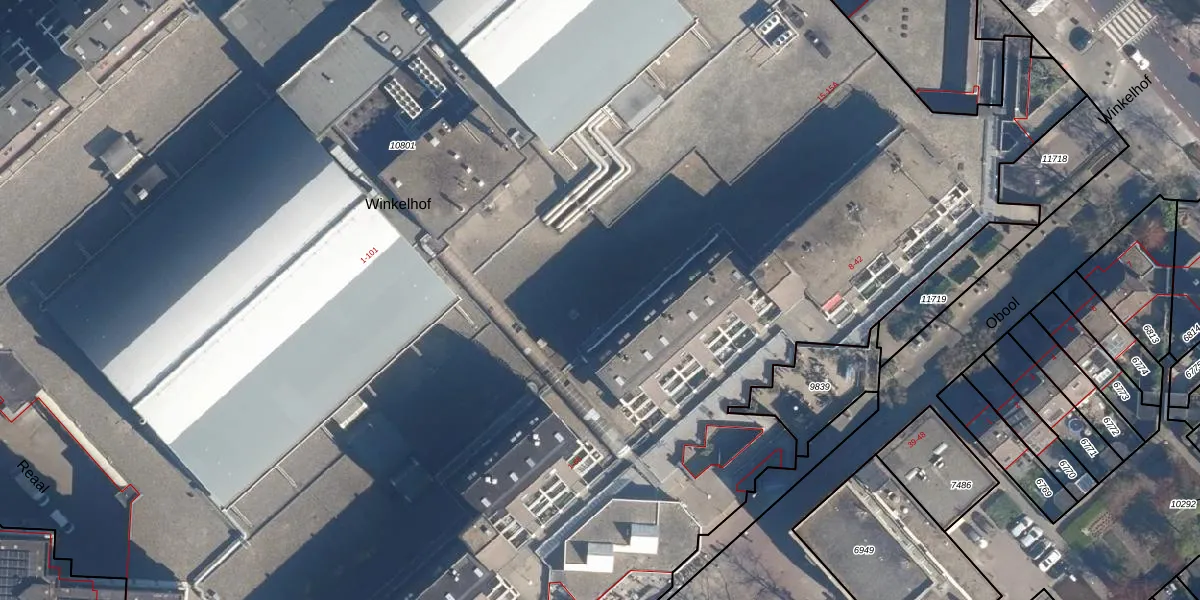 Het perceel waarop Winkelhof 10 staat heeft een oppervlakte van 2,4 ha. Dit is een zeer groot perceel. De perceeloppervlakte wordt geregistreerd door het Kadaster. Gedetailleerde informatie over de maten van dit perceel kunt u vinden in het rapport Kadastrale kaart met maatvoering van Winkelhof 10.
