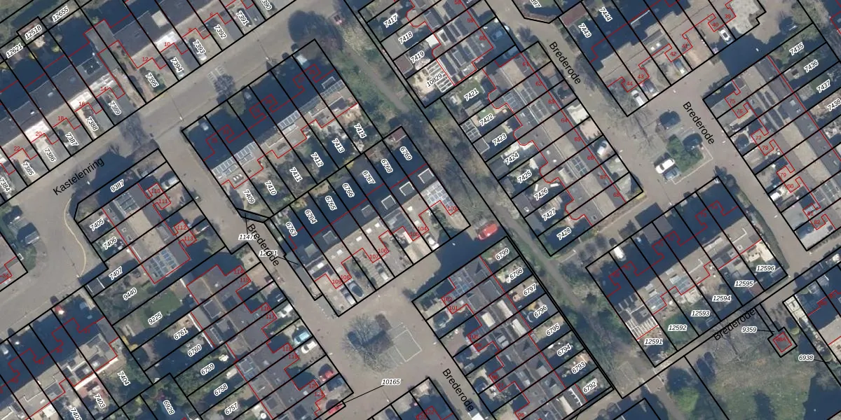 Brederode 104 is gelegen op kadastraal perceel VEU00B6768. Deze kadastrale aanduiding is uniek en wordt gebruikt door het Kadaster om eigendomsrechten en andere zakelijke rechten vast te leggen. Het perceel maakt onderdeel uit van de kadastrale gemeente Veur.