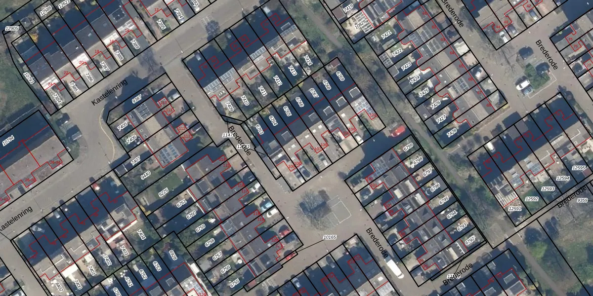 Brederode 108 is gelegen op kadastraal perceel VEU00B6764. Deze kadastrale aanduiding is uniek en wordt gebruikt door het Kadaster om eigendomsrechten en andere zakelijke rechten vast te leggen. Het perceel maakt onderdeel uit van de kadastrale gemeente Veur.
