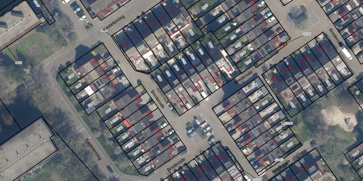 Brederode 134 is gelegen op kadastraal perceel VEU00B6749. Deze kadastrale aanduiding is uniek en wordt gebruikt door het Kadaster om eigendomsrechten en andere zakelijke rechten vast te leggen. Het perceel maakt onderdeel uit van de kadastrale gemeente Veur.
