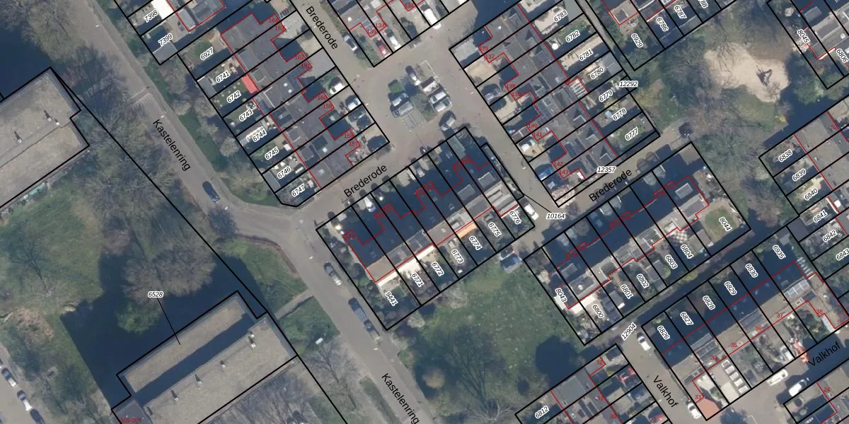 Brederode 153 is gelegen op kadastraal perceel VEU00B6773. Deze kadastrale aanduiding is uniek en wordt gebruikt door het Kadaster om eigendomsrechten en andere zakelijke rechten vast te leggen. Het perceel maakt onderdeel uit van de kadastrale gemeente Veur.
