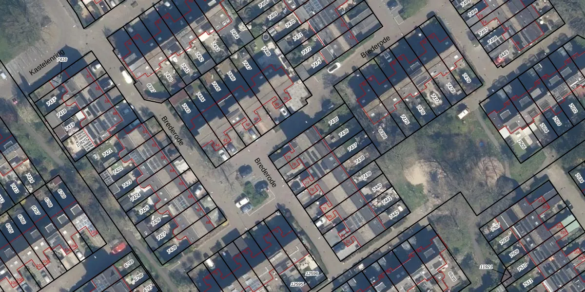 Brederode 75 is gelegen op kadastraal perceel VEU00B7435. Deze kadastrale aanduiding is uniek en wordt gebruikt door het Kadaster om eigendomsrechten en andere zakelijke rechten vast te leggen. Het perceel maakt onderdeel uit van de kadastrale gemeente Veur.