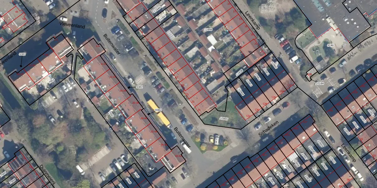 Buitenwater 21 is gelegen op kadastraal perceel VEU00B11848. Deze kadastrale aanduiding is uniek en wordt gebruikt door het Kadaster om eigendomsrechten en andere zakelijke rechten vast te leggen. Het perceel maakt onderdeel uit van de kadastrale gemeente Veur.