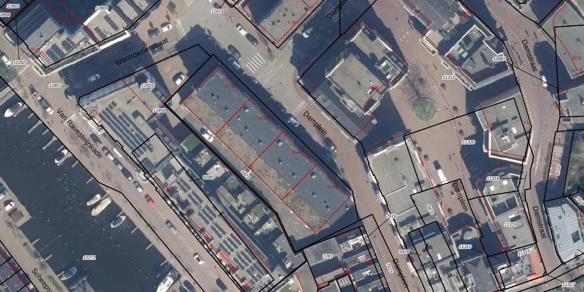 Het perceel waarop Damplein 33 staat heeft een oppervlakte van 1737 m². Dit is een zeer groot perceel. De perceeloppervlakte wordt geregistreerd door het Kadaster. Gedetailleerde informatie over de maten van dit perceel kunt u vinden in het rapport Kadastrale kaart met maatvoering van Damplein 33.