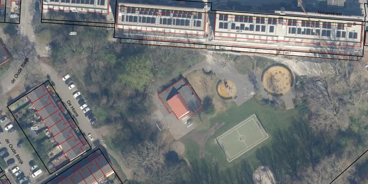 Het perceel waarop De Horre 1 staat heeft een oppervlakte van 12,1 ha. Dit is een zeer groot perceel. De perceeloppervlakte wordt geregistreerd door het Kadaster. Gedetailleerde informatie over de maten van dit perceel kunt u vinden in het rapport Kadastrale kaart met maatvoering van De Horre 1.