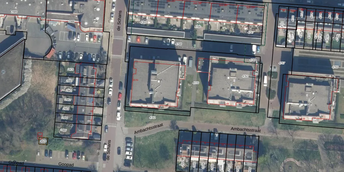 Het perceel waarop de Schans 49 staat heeft een oppervlakte van 2561 m². Dit is een zeer groot perceel. De perceeloppervlakte wordt geregistreerd door het Kadaster. Gedetailleerde informatie over de maten van dit perceel kunt u vinden in het rapport Kadastrale kaart met maatvoering van de Schans 49.