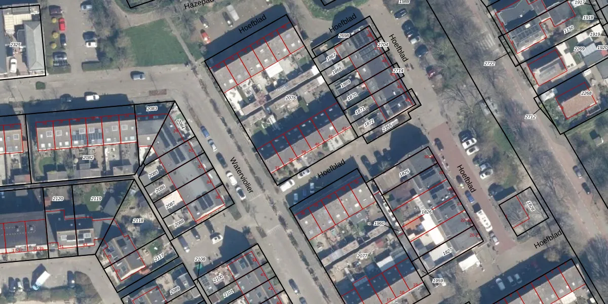 Het perceel waarop Hoefblad 39 staat heeft een oppervlakte van 1465 m². Dit is een zeer groot perceel. De perceeloppervlakte wordt geregistreerd door het Kadaster. Gedetailleerde informatie over de maten van dit perceel kunt u vinden in het rapport Kadastrale kaart met maatvoering van Hoefblad 39.